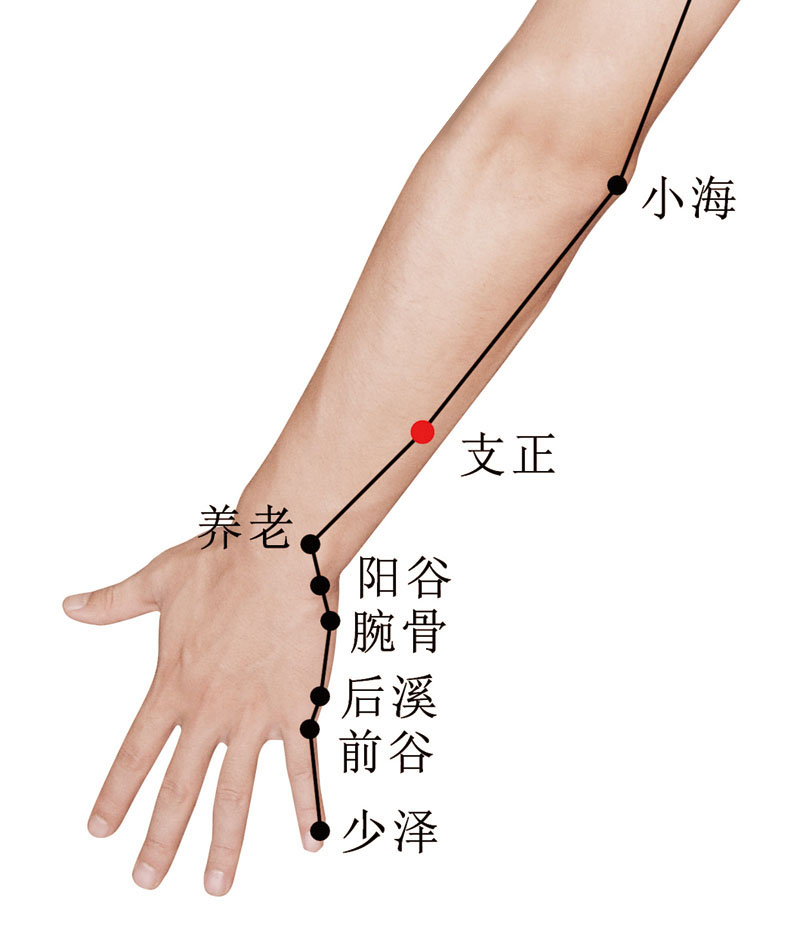 屈肘俯掌。先确定阳谷(参见“阳谷”)与小海(参见“小海”)的位置。取阳谷与小海连线的中点处再向下量1横指处,即为本穴。 -